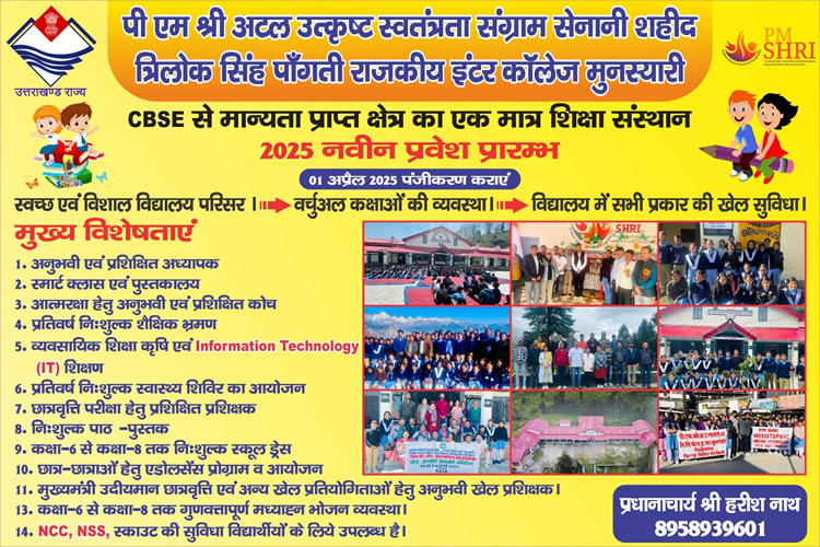 PM SHRI ATAL UTKRISHT S.S.S.S.T.S.P. G.I.C Munsyari was established in 1954 and it is managed by the Department of Education. It is located in Rural/Urban area. It is located in Munsyari block of Pithoragarh district of Uttarakhand. The school consists of Grades from 6 To 12. The school is Co-educational is dedicated to providing excellent education and helping students grow into future leaders, while fostering a supportive and enriching learning environment. Hindi/English is the medium of instructions in this school. This school is approachable by all weather road. In this school academic session starts in April.